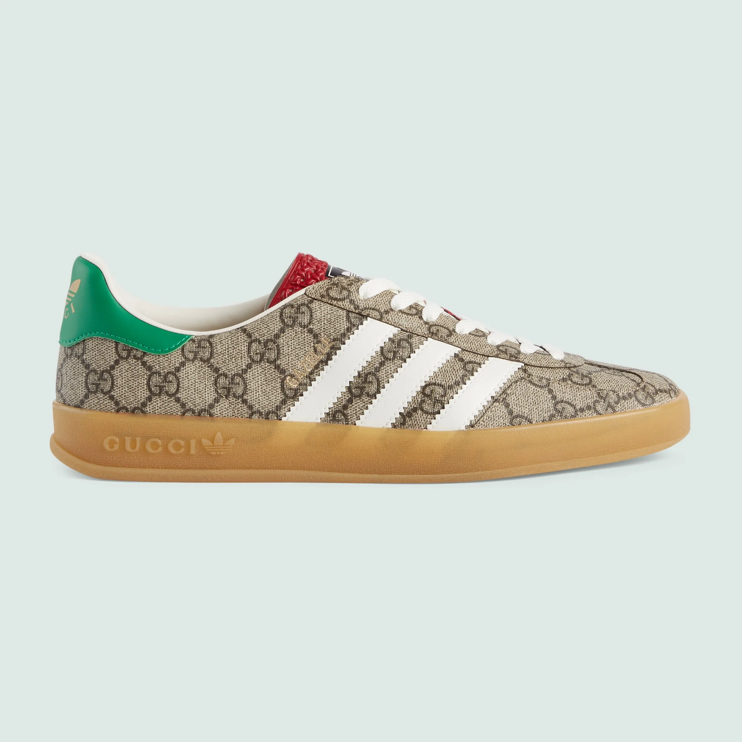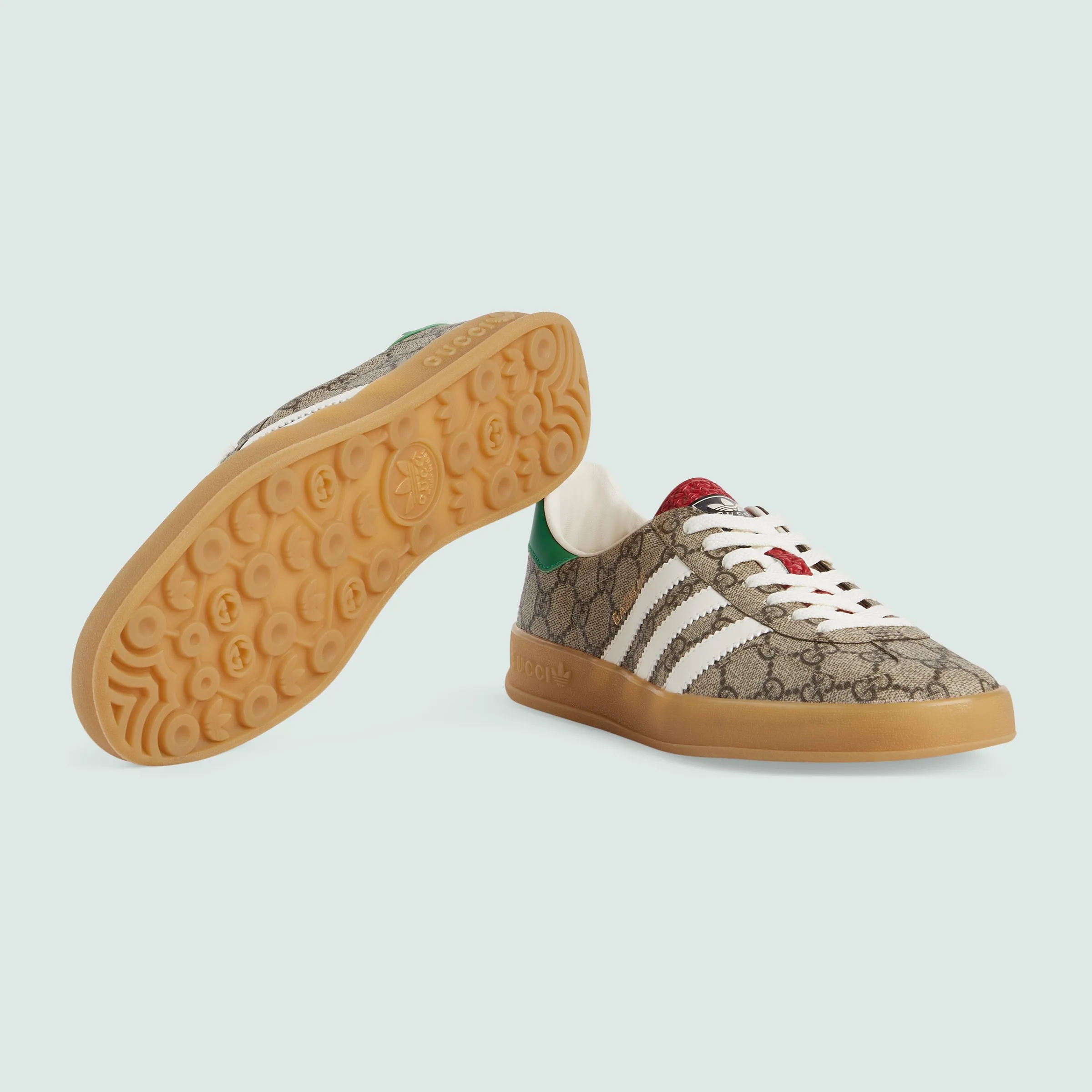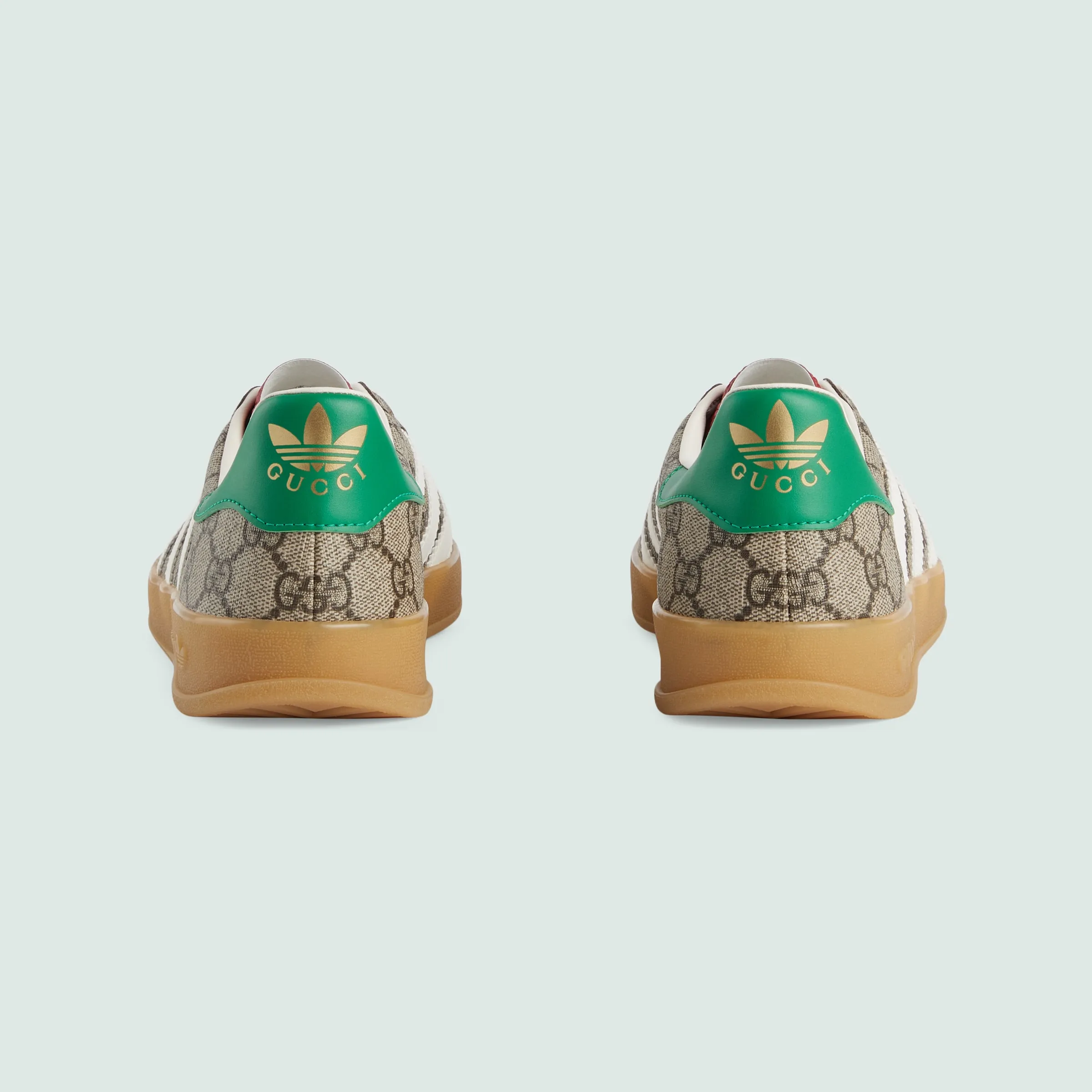 ウェブ ストライプとホワイトの3本線を融合させ、GGパターンとトレフォイルを組み合わせた、adidas x Gucci コレクションの第2弾。クリエイティブ・ディレクター、アレッサンドロ・ミケーレの1980年代から1990年代にかけての記憶を着想源に、グッチを象徴するモチーフと歴史あるスポーツウェアブランドであるアディダスのロゴをミックスすることで生まれた、ハイブリッドなラインです。グッチを象徴する〔ガゼル〕スニーカーを、ベージュ&エボニー GGスプリーム キャンバスで仕立てました。